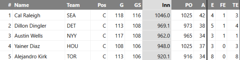 AL 2025 Innings Caught Leaders (Fangraphs)