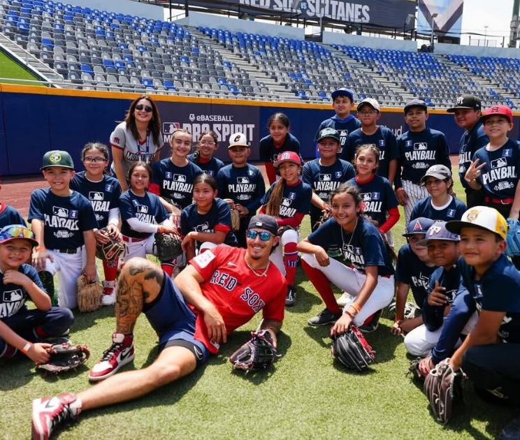 Jarren Duran poses with youth baseball in Mexico during a preseason game in Mexico City - Jarren Duran’s Instagram @duranjarren