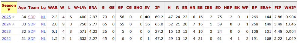 Robert Suarez Pitching 2022-2025 (Baseball Reference)